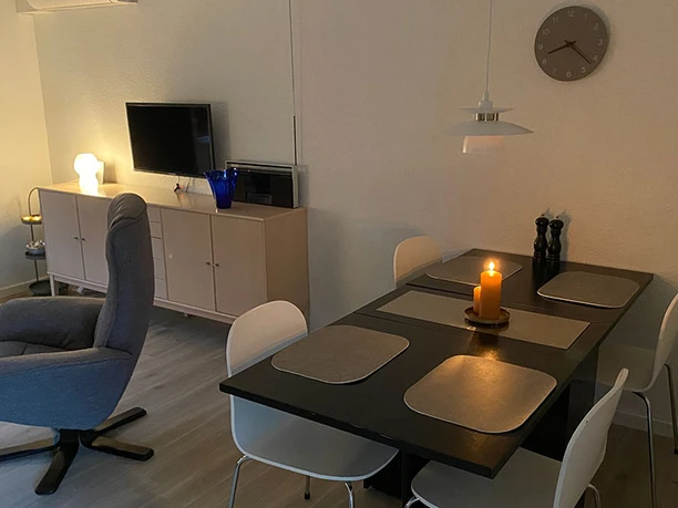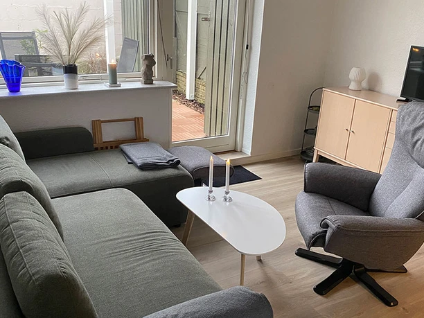 Ferielejligheden har plads til 4 personer. Der er et soveværelse med dobbeltseng og en sovesofa i stuen med plads til 2 personer.