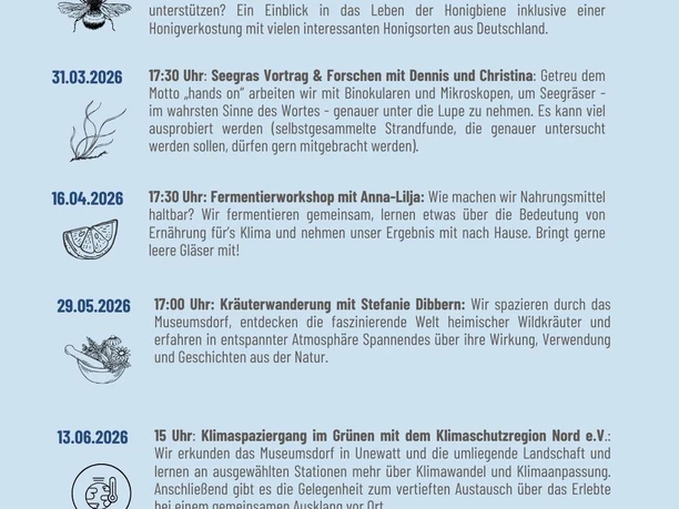 We will explore the museum village in Unewatt and the surrounding landscape, learning more about climate change and climate adaptation at selected stations. Afterwards, there will be an opportunity for a deeper exchange about the experiences during a collective conclusion on site.