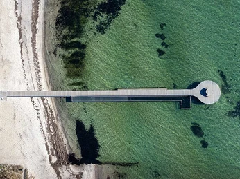 The beach has a bathing jetty and a ramp at the water’s edge provides easy access in a wheel chair. The name den Sorte Badestrand (black beach) originates from a former bathing establishment that was located here and whose buildings were painted black.