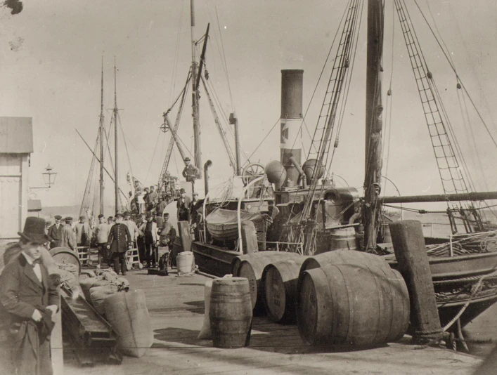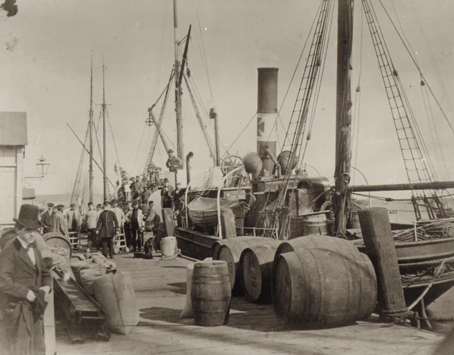 At the dockyard „Flensburger Schiffsbau-Gesellschaft“, founded in 1872, around 300 ships were built by 1910, including only 12 iron square riggers. Among the clients were many new Flensburg shipping companies, such as the steamboat association „Flensburger Dampfschifffahrts-Gesellschaft“ of 1869. Their steamships made cargo voyages to the North and Baltic Seas. They landed coal from England, timber from Sweden and Finland, and grain from Russia. This shipping company even participated in Chinese coastal shipping and assigned ships in transatlantic voyages to the South and North Americas.