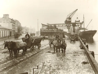 Originally, the berths of the coastal sailing ships were located at the southern end of the ship-bridge. They mainly brought agricultural products from the surrounding countryside to the city. In the course of the 19th century, a harbour and bridge ordinance ensured that the charging and discharging berths were used appropriately, which also took into account the emerging steamship traffic. They also decided on a first steamship-bridge around 1840 at the height of Norderfischerstraße.