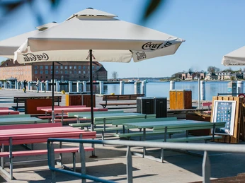 Enjoy the view over the harbour of Sønderborg, let the children play in our sandbox boat and taste our delicious ice.